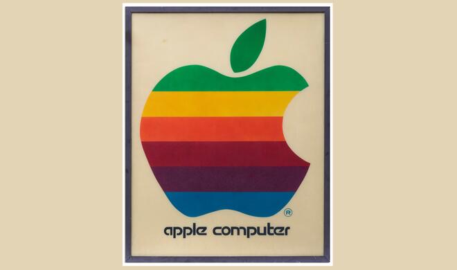 ReklametafelOriginales Apfel-Logo von Apple wird versteigert Ein Plexiglas-Schild, auf dem das alte, sechsfarbige Apple-Logo zu sehen ist, soll in den USA versteigert werden. Wer dabei sein will, braucht eine Menge Spielgeld.