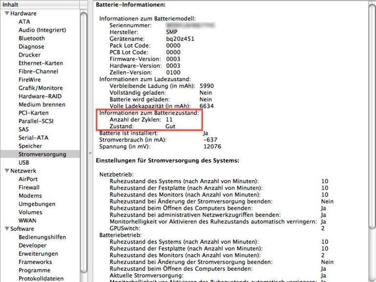 Wollen Sie feststellen, wie viele Ladezyklen der Akku Ihres MacBook schon auf dem „Buckel“ hat, dann starten Sie dazu den System Profiler über das Apple-Menü, den Eintrag Über diesen Mac sowie den Schalter Weitere Informationen. Die Anzahl der Ladezyklen finden Sie über den Eintrag Stromversorgung.