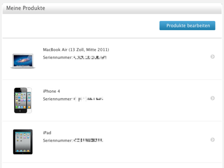 Auf dem Supportprofil werden sämtliche direkt bei Apple gekauften Geräte automatisch gelistet. Alle anderen Apple-Produkte (außer Zubehör) kann mithilfe der Seriennummer erfasst werden