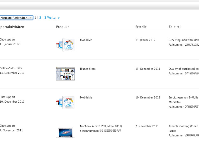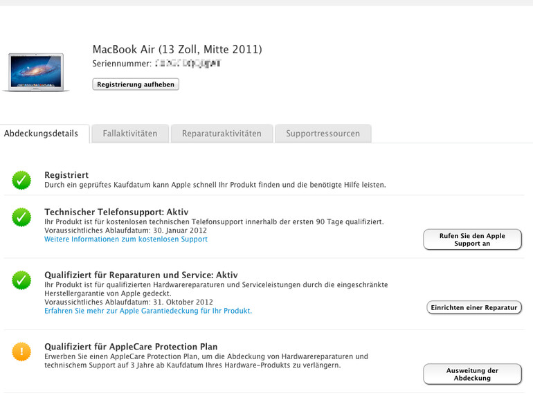 Einkäufe bei anderen Anbietern wie Gravis, Media Markt und Co. müssen jedoch erst unter supportprofile.apple.com registriert werden. Ist dies erledigt, werden nicht nur Ihre Apple-Produkte säuberlich aufgelistet, sondern auch Details zu den Geräten. Während die Abdeckungsdetails Aufschluss über die Registrierung geben und Ihnen zeigen, ob Sie Anspruch auf kostenlosen Telefonsupport, Reparaturen und Service sowie AppleCare haben, zeigen Ihnen die Kategorien Fall- und Reparaturaktivitäten alle vergangenen Service-Anfragen an. Unter Supportressourcen finden sich vor allem für Eigentümer eines neuen Apple-Produktes Links zu Support-Dokumenten.