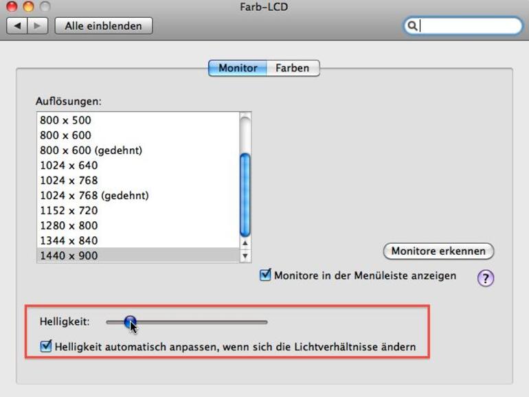 Auch wenn Apple in den aktuellen MacBooks die stromsparende LED-Technologie einsetzt, so sollten Sie das Display immer nur so hell einstellen wie es unbedingt notwendig ist. In relativ dunkler Umgebung können Sie die Helligkeit sogar auf ein Mindestmaß reduzieren.