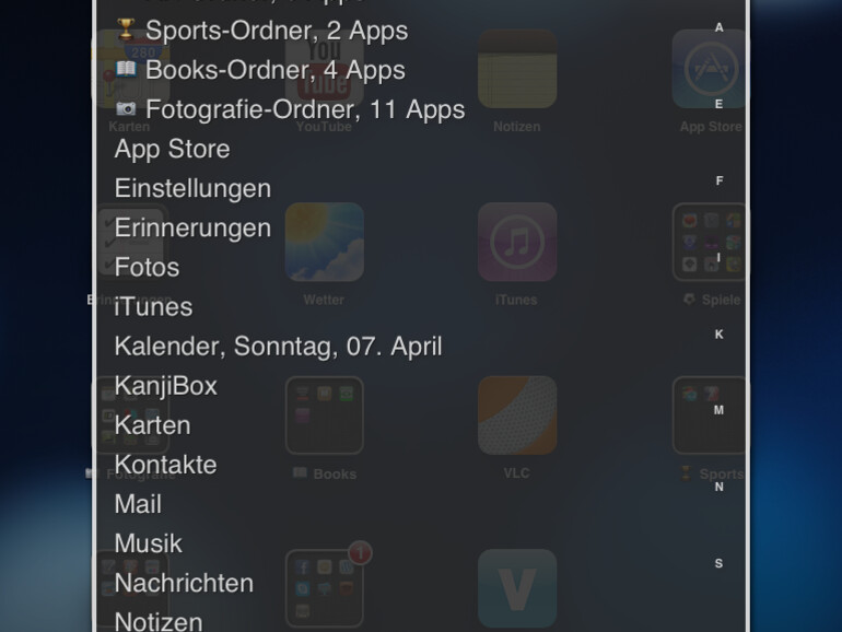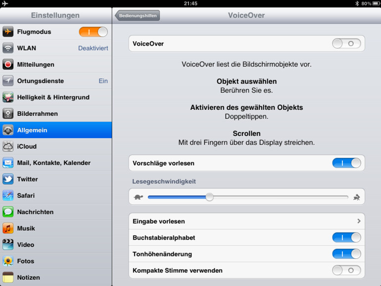 Für die folgenden Tastenkürzel müssen Sie in den iOS-Einstellungen unter Allgemein/Bedienungshilfen VoiceOver aktiviert haben.