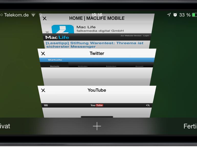 Denn eine eigene „Alle Tabs schließen“-Funktion kennt Safari leider nicht. Wenn Sie jedoch unten rechts in die Tab-Ansicht wechseln, führt ein Tipp auf die Schaltfläche Privat und die Antwort Schließen im darauffolgenden Dialog zum gleichen Resultat. Achten Sie darauf, den Privat-Modus wieder zu deaktivieren, wenn alle Tabs geschlossen wurden.
