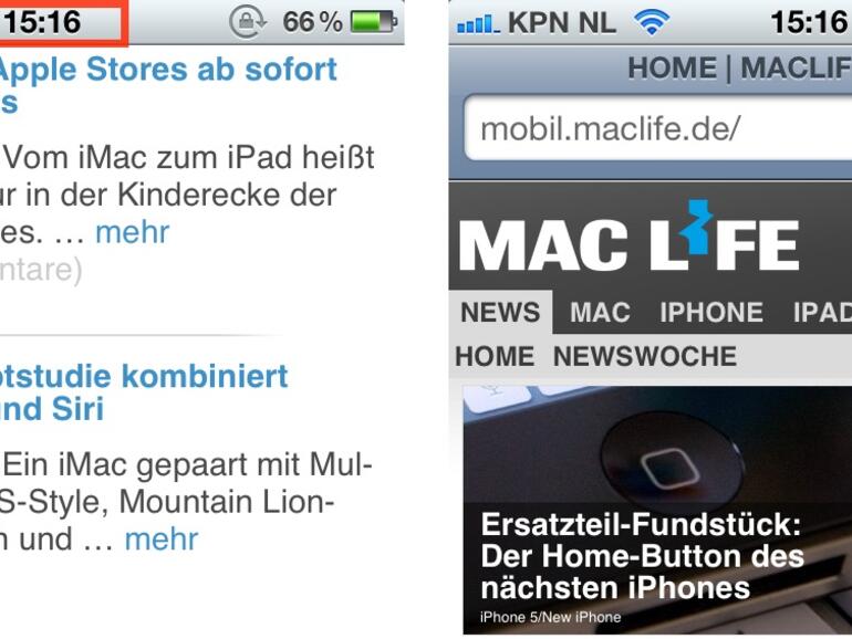Um wieder an das obere Ende einer App zu gelangen, genügt es kurz auf die Menüleiste zu tippen, etwa auf die Uhr. Der fliegende Wechsel „zurück auf Start“ funktioniert in Safari, dem Adressbuch, dem App Store sowie vielen weiteren Apple-eigenen Anwendungen sowie in vielen Apps anderer Hersteller.