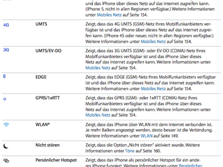 In dieser, die sich in der offiziellen iPhone-Bedienungsanleitung befindet, wird beispielsweise erklärt, dass der Kreis, der nur in den seltensten Fällen neben dem Namen des Netzanbieters auftauchen dürfte, für eine Datenverbindung per GPRS steht – dem langsamsten Verbindungsstandard. Die zwei ineinandergreifenden Ovale deuten wiederum an, dass die Datenverbindung des iPhones derzeit mit einem anderen Gerät geteilt wird.