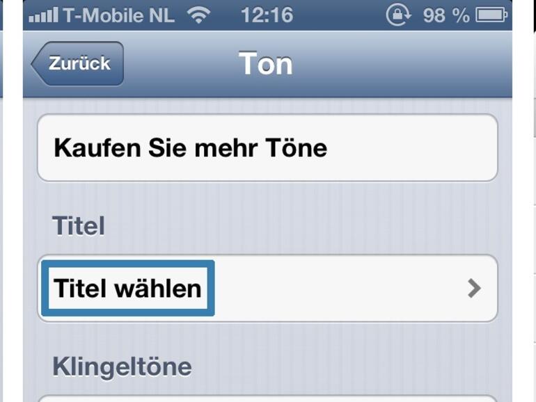 In der Uhr-App im Reiter Wecker versteckt sich die Möglichkeit im Bearbeiten-Menü. Ein Tipp auf den Menü-Eintrag Ton und ein kräftiger Wisch nach von oben nach unten bringt Sie in der Liste der verfügbaren Wecktöne ganz nach oben. Ein Tipp auf Titel wählen führt Sie anschließend in Ihre iTunes-Bibliothek.