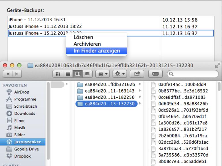 Öffnen Sie dazu iTunes und wechseln Sie über das Menü iTunes in die Einstellungen. Ihre Backups finden Sie im Reiter Geräte. Klicken Sie nun auf das gewünschte Backup und öffnen Sie das Kontextmenü mit der rechten Maustaste, um dort den Befehl Im Finder anzeigen zu wählen.