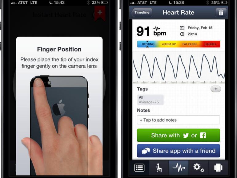Wie auch in anderen Szenarien gilt für das Thema Pulsmessung: There’s an App for that. Mit Instant Heart Rate, die kostenlos im App Store zum Download bereitsteht, wird aus Ihrem iPhone oder iPod touch im Handumdrehen ein Pulsmessgerät. Wie die Programmierer schreiben, funktioniert die Messung mit einem iPhone mit Blitz besser als mit den beiden ersten iPhones oder dem iPod touch.