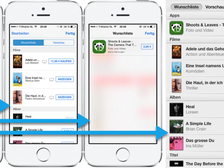 Um einen Titel in die Wunschliste zu legen, genügt es kurz oben rechts die Teilen-Taste zu tippen und anschließend im Teilen-Menü die Schaltfläche Zur Wunschliste hinzufügen zu wählen. Alle gespeicherten Filme, Serien, Musiktitel und Alben können in der iTunes-App künftig oben ganz rechts über das Listen-Symbol aufgerufen werden. Kostenpflichtige Apps zeigt iOS Ihnen hingegen nur im App Store unter der gleichen Schaltfläche an.