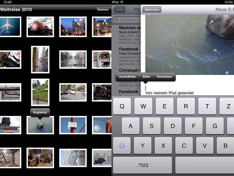 Starten Sie die Mail-App und legen Sie eine neue E-Mail an. Wechseln Sie danachzurück in Fotos und halten Sie ein Bild, das Sie versenden möchten, länger gedrückt. Es erscheint ein Kopieren-Menü. Klicken Sie es an, und wechseln Sie zurück zur Mail-Anwendung. Fügen Sie das Bild dort auf die gleiche Weise in die E-Mail ein. Wiederholen Sie diesen Vorgang, bis Sie alle Bilder in der E-Mail haben, und schicken Sie sie danach ab.