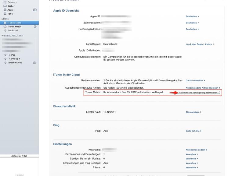 5. In der jetzt angezeigten Account-Daten-Ansicht findet sich im „iTunes in der Cloud“-Abschnitt die neue Schaltfläche „Automatische Verlängerung deaktivieren“ – mit einem Klick auf diesen Button schalten sie die automatische Verlängerung ihres „iTunes Match“-Abos aus.
