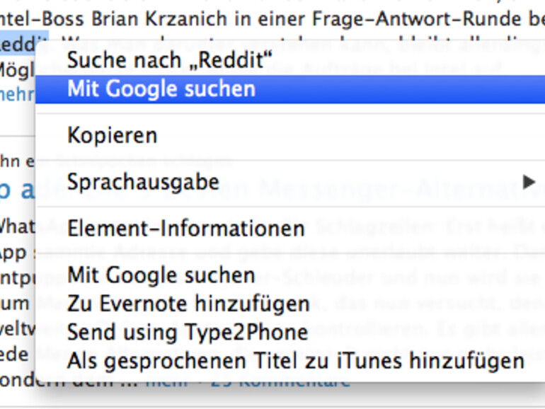 Um bequem in die Google-Suche zu wechseln, muss das gewünschte Wort lediglich markiert und mit einem Rechtsklick das Kontextmenü aufgerufen werden. Ein Klick auf Mit Google suchen öffnet direkt den Browser und das zugehörige Suchresultat.