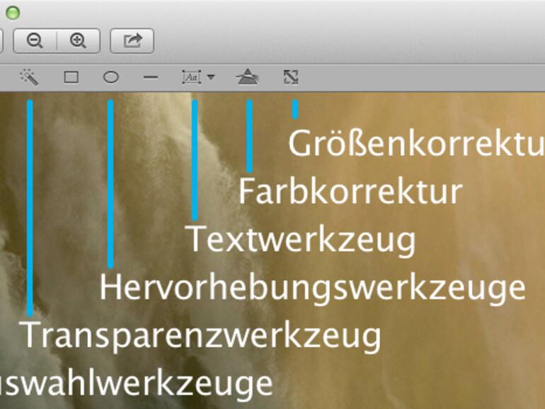 Des weiteren können mithilfe des Transparenz-Werkzeuges, das auch in Apples iWork-Programmen zu finden ist, Bildausschnitte gelöscht werden. Klicken Sie dazu einfach auf den zu löschenden Ausschnitt und bewegen Sie den Mausanzeiger bei gedrückter Maustaste von der Ursprungsstelle weg. Alles was Vorschau Rot markiert, kann anschließend mit der Rückschritt- oder Entfernen-Taste gelöscht werden.