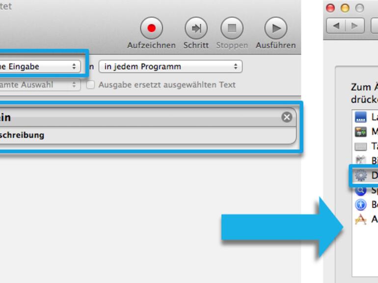 Um das Tastenkürzel einzurichten, öffnen Sie die Kurzbefehle in den Tastatur-Einstellungen und wählen Sie links Dienste. Markieren Sie in der Liste rechts den neuen Befehl und vergeben Sie einfach ein gewünschtes Tastenkürzel.