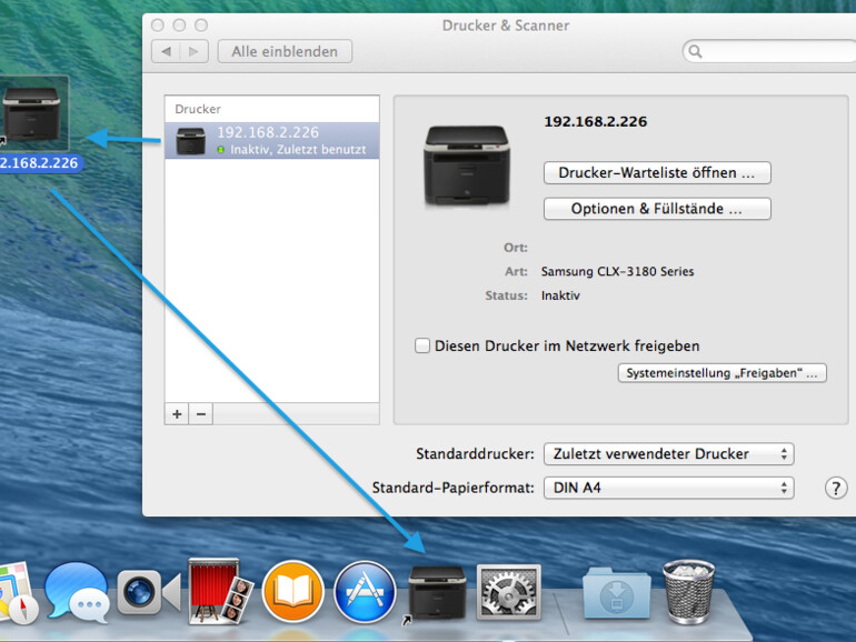 Wie wäre es, wenn eine Datei lediglich per Drag & Drop auf ein Symbol gezogen werden muss, damit der Druckauftrag startet? Genau das ist mit ein paar Klicks möglich. Öffnen Sie einfach in den Systemeinstellungen die Kategorie Drucker & Scanner und ziehen Sie das kleine Druckersymbol links oder das große Drucker-Symbol in der Mitte auf den Schreibtisch. Bewegen Sie die Verknüpfung anschließend vom Schreibtisch in das Dock.