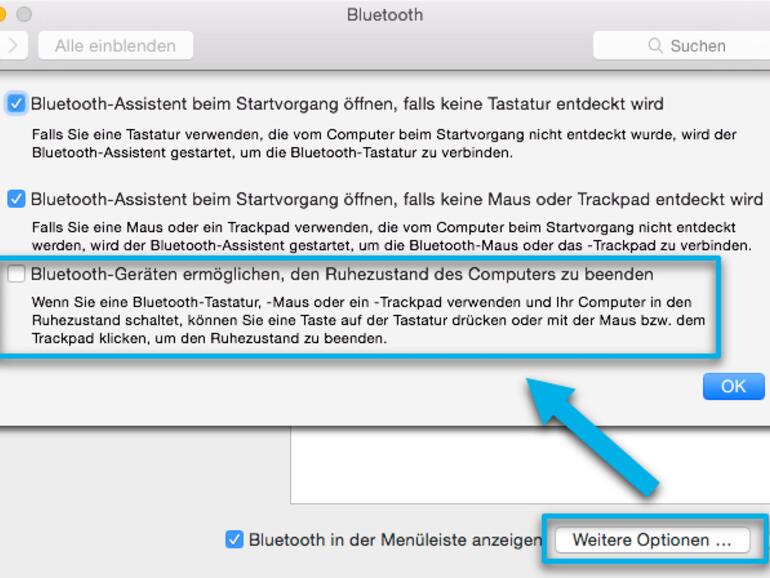 Denn dort kann in den weiteren Optionen unten rechts mit einem Klick die Weckmöglichkeit durch Bluetooth-Geräte ausgeschalten werden. Einziger Nachteil: Wer einen iMac, Mac Pro oder Mac mini sein Eigen nennt, muss dann künftig zum Beenden des Standbys die Ein-/Ausschalttaste betätigen.