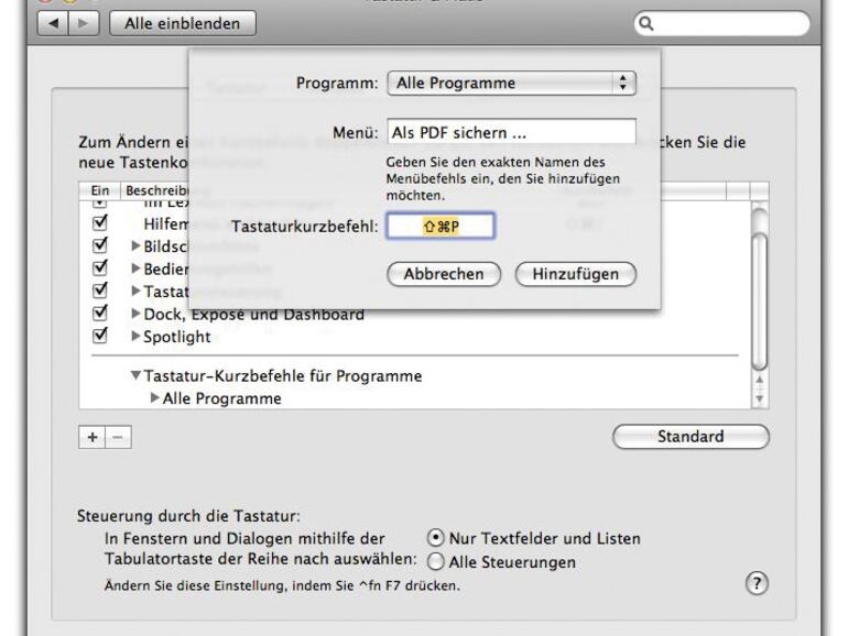 Wichtig ist dabei, den genauen Wortlaut des Menüpunkts zu übernehmen, in diesem Fall also „Als PDF sichern ...“ – natürlich ohne Nutzung der Anführungszeichen. Im Feld „Tastaturkurzbefehl“ muss nun nur noch die für Sie am besten passende Tastaturkombination festgelegt werden, beispielsweise [Wahl]-[Shift]-p.