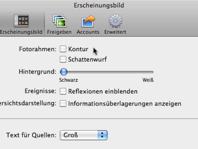 Öffnen Sie dazu über das Menü iPhoto die Einstellungen. Hier schalten Sie im Register Erscheinungsbild den Fotorahmen ab, in dem Sie die Optionen Kontur sowie Schattenwurf deaktivieren. Als nächstes wenden Sie sich der Darstellung der Ereignisse zu. Hier entfernen Sie den Haken vor der Einstellung Reflexionen einblenden. Im Anschluss kommen auch ältere Macs wieder besser mit iPhoto zurecht.