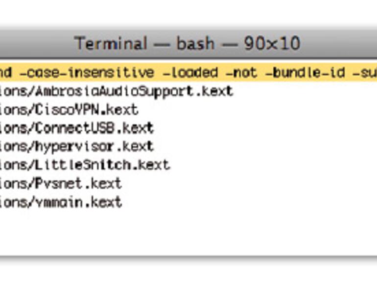 Mit dem neu unter Mac OS X 10.5 hinzugekommenen Befehl kextfind lassen sich durch eintippen in ein Terminal-Fenster (Programm „Terminal“) jedoch alle Kernel-Erweiterungen des Rechners anzeigen. Um die Anzahl der Erweiterungen herauszufinden geben Sie kextfind | wc -l ein. Der Zusatz wc -l zählt die Zeilen, die durch den vorangehenden Befehl ausgegeben werden. Sollen hingegen nur die systemeigenen Erweiterungen angezeigt werden nutzen Sie diesen Befehl: