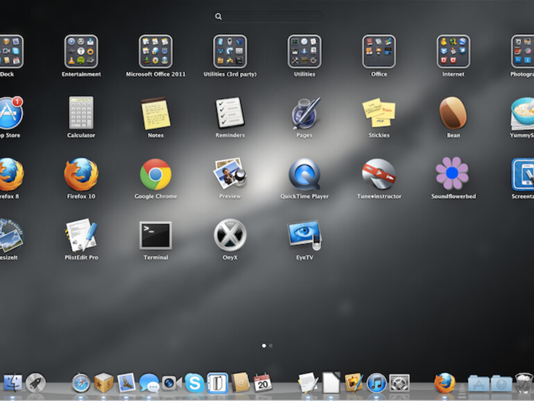 Allerdings besteht die Änderung nur darin, den Effekt zu wechseln, mit dem das Hintergrundbild versehen wird. Durch Drücken der Tastenkombination ctrl+alt+cmd+B (⌃⌥⌘B) kann der Wechsel vorgenommen werden. Dabei ändert Launchpad zunächst die Stärke der Weichzeichnung des farbigen Hintergrundbildes. Im Anschluss wird dieses dann auch schwarz-weiß dargestellt, wiederum mit der Möglichkeit einer klaren oder verwischten Version.