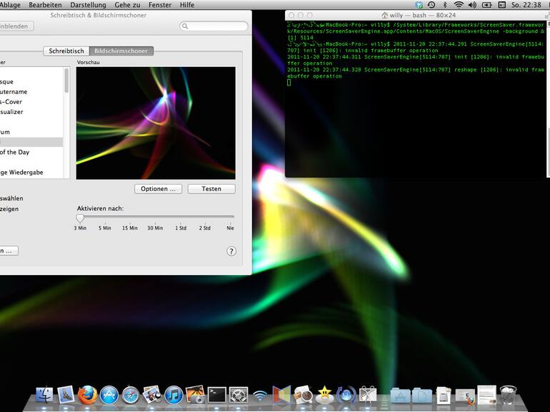 Mit folgendem Terminal-Befehl binden Sie den in den Systemeinstellungen ausgewählten Screensaver als Desktop-Hintergrund ein.