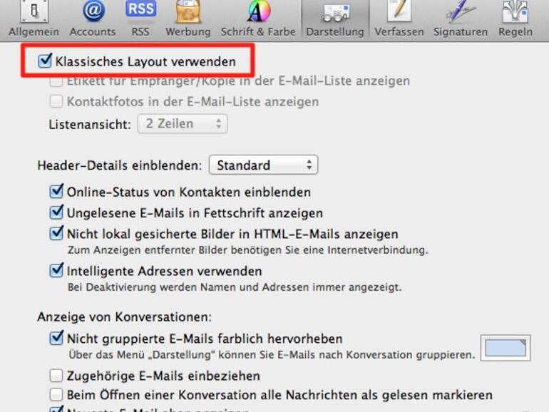 Um die Mail-Anwendung auf die klassische Ansicht zurückzusetzen, klicken Sie bei geöffneter Mail.app in der Menüleiste auf Mail. Wählen Sie dort den Eintrag Einstellungen … aus und wechseln Sie im Einstellungen-Fenster auf den Reiter Darstellung. Setzen Sie abschließend den Haken vor Klassisches Layout verwenden.