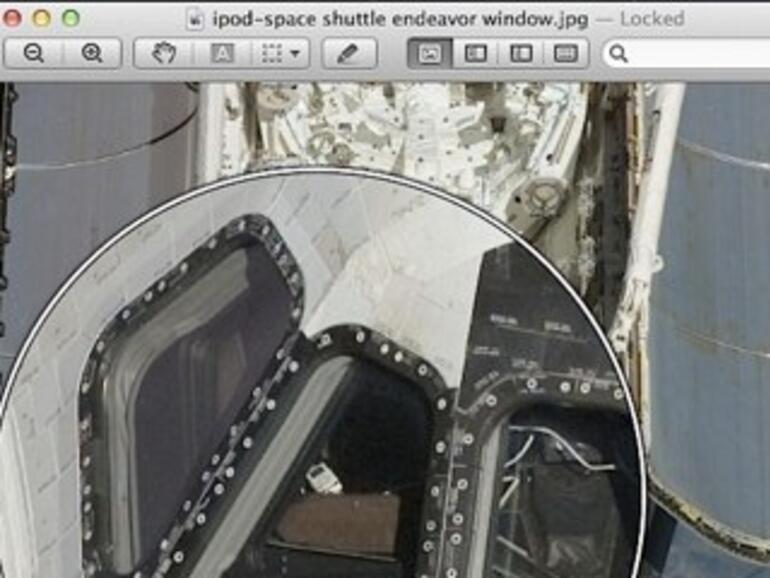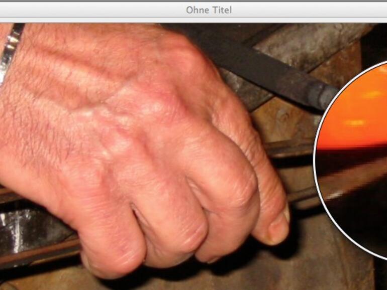 Um ausgewählte Bildbereiche vergrößert betrachten zu können, lässt sich in der Vorschau-App unter OS X Lion eine Lupe aktivieren, die dem Mauszeiger über die Bildbereiche folgt. Die Lupe kann in die Symbolleiste über die Option „Symbolleiste anpassen“ integriert werden.