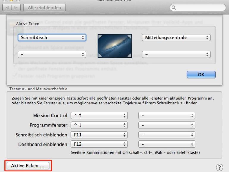 Eine Alternative zum Tastenkürzel stellt eine aktive Ecke dar. Die Einrichtung der Aktiven Ecken findet sich in den Systemeinstellungen unten rechts unter Mission Control. In den vier Auswahl-Menüs steht die Mitteilungszentrale an fünfter Stelle. Einmal aktiviert, genügt es zukünftig die Maus in die von Ihnen ausgewählte Ecke zu schieben, um die Mitteilungszentrale aus dem Nichts auftauchen zu lassen. Soll diese wieder in den Hintergrund abtauchen, genügt es irgendwo außerhalb der Zentrale zu klicken, oder aber die Maus erneut in die aktive Ecke zu bewegen.