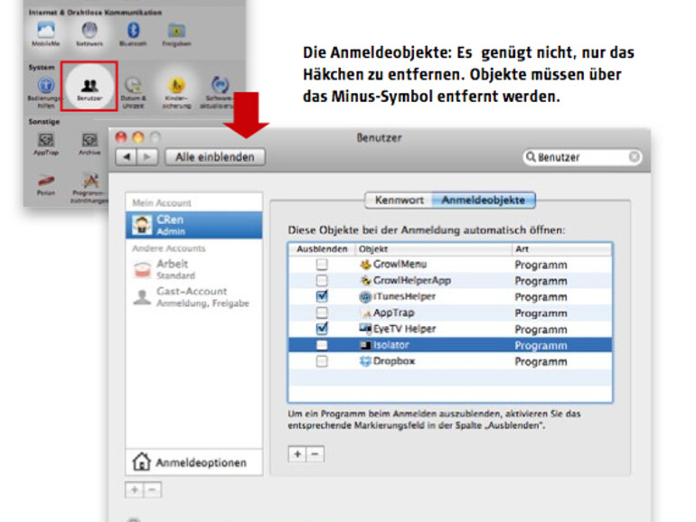 Um die Startobjekte zu überprüfen, müssen Sie die Systemeinstellungen aus dem Programme-Ordner starten und dort den Punkt Benutzer anwählen. Im folgenden Menü wählen Sie den Benutzer aus, mit dem sie normalerweise arbeiten und klicken dann das Tab Anmeldeobjekte an. Dort sollten Sie im Idealfall möglichst wenige Objekte sehen. Die Logik ist recht einfach: Aktivierte Programme und Dienste werden automatisch gestartet, die ohne Häkchen zumindest angezeigt. Schauen Sie nun, was Sie nicht mehr benötigen, markieren sie es und drücken Sie anschließend den Minus-Knopf unterhalb der Objekte-Liste. Es ist auch möglich, Programme über das Plus-Symbol hinzuzufügen. Wenn Sie etwa jedes Mal nach dem Systemstart Word benötigen, können sie das Programm damit zu den automatisch startenden Objekten hinzufügen.