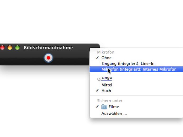 Starten Sie über den roten Schalter die Filmaufnahme, und führen Sie nacheinander die Aktionen aus, die Sie aufzeichnen wollen. Wenn diese abgearbeitet sind, stoppen Sie die Aufnahme über die Tastenkombination [cmd]+[ctrl]+[esc]. Nun erhalten Sie die Möglichkeit, über das Menü Ablage den Film zu sichern.