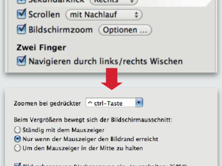 Klicken Sie anschließend auf Optionen, und wählen Sie einen Hotkey – etwa die [ctrl]-Taste – als „Auslöser“ aus. Halten Sie diese Taste gedrückt, können Sie jederzeit mit der Maus oder dem Trackpad den Bildschirm heran- und herauszoomen. Sinnvoll ist zudem das Aktivieren der Option Ständig mit dem Mauszeiger – damit folgt der vergrößerte Bereich immer Ihrer Maus.
