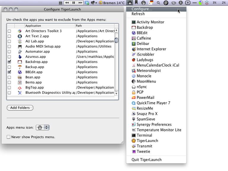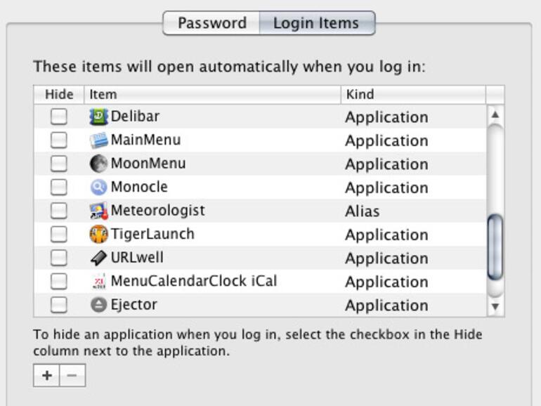 Mehrere Arten von Menulets können sich in Menüleiste einnisten. Das sind erstens einige Systemerweiterungen, die von Apple und anderen kommen. Hier schaut man in den Systemeinstellungen nach einem zu markierenden Auswahlfeld wie es sich zum Beispiel im Kontrollfeld „Monitore“ befindet: „Monitor in der Menüleiste anzeigen“ gilt es anzuwählen, wenn man das entsprechende Menulet anzeigen lassen will. Zweitens handelt es sich um „normale“ Programme, die – solange sie laufen – ihr Icon in der Menüleiste belassen und ein Menü mit Einstellungen und Funktionen bereitstellen. Möchte man diese Programme automatisch beim Systemstart öffnen, dann legt man sie in den so genannten „Anmeldeobjekten“ ab, die man in den „Systemeinstellungen“ unter „Benutzer“ findet. Dort klickt man auf das Plus-Zeichen, um einen Eintrag hinzuzufügen, beziehungsweise auf das Minus-Zeichen, um ein Programm mit zugehörigem Menü-Eintrag wieder loszuwerden. Es gilt zu bedenken: Je mehr Programme automatisch bei der Anmeldung gestartet werden, desto länger dauert der Startvorgang.