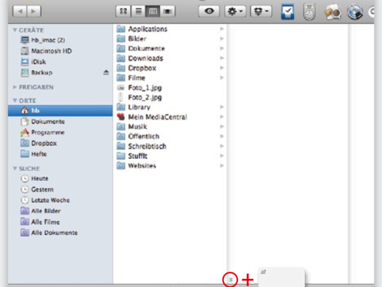 Ziehen Sie in einem Finder-Fenster eine Spalte größer oder kleiner, um zum Beispiel Dateinamen vollständig sichtbar zu machen, so hat sich der Finder diese Einstellung nicht gemerkt, wenn Sie ein neues Finder-Fenster öffnen. Möchten Sie alle Spalten gleichzeitig und dauerhaft in Ihrer Breite ändern, klicken Sie mit gedrückter [alt]-Taste auf den Anfasser am unteren Ende der ersten Spaltenbegrenzung und ziehen Sie die Spalte auf die gewünschte Breite auf.