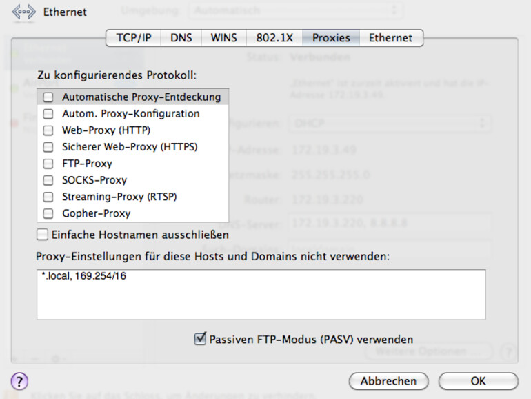 Darunter fallen die Verbindungsgeschwindigkeit zwischen Rechner und Router, Router und Internet und natürlich die Anbindung des FTP-Servers sowie die Tatsache, ob Router und Firewalls zwischengeschaltet sind oder nicht. Leider ist auch Mac OS X grundsätzlich kein System, mit dem FTP-Übertragungen wirklich Freude machen. Um die Geschwindigkeit zu verbessern, sollte der erste Weg in die Systemeinstellungen führen: Wählen Sie unter Netzwerk Ihre Verbindung aus und klicken Sie auf Weitere Optionen. Klicken Sie im folgenden Menü auf das Tab Proxies und setzen Sie dort einen Haken bei Passiven FTP-Modus (PASV) verwenden. Durch die Verwendung der passiven FTP-Übertragung sollte sich die Geschwindigkeit in wechselnden Umgebungen deutlich erhöhen, denn damit teilt Ihr Mac dem FTP-Server mit, dass die Verbindung durch eine Firewall oder einen Router hindurch arbeitet, und gibt dem FTP-Server die Kommunikationsports durch – ähnlich einer Durchwahl beim Telefon. Der aktive FTP-Modus ist daher nicht mehr sinnvoll, auch das Durchleiten der Ports durch Firewalls und Router ist damit hinfällig. Trotzdem ist es zur Optimierung immer gut, die FTP-Ports 20 und 21 durch Router und Firewalls durchzuleiten. Achtung: Das Durchleiten der FTP-Ports kann ein Sicherheitsrisiko darstellen, verzichten Sie also wenn möglich auf diese Option!
