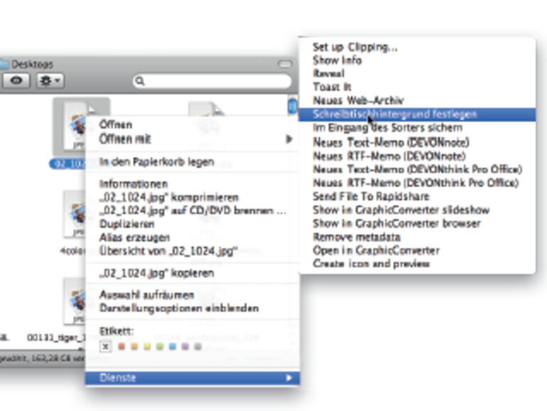 Zusätzlich lassen sich beliebige Bilddateien – in der Regel im JPG-Format – auch direkt als Schreibtischhintergrund einrichten. Öffnen Sie dazu das Kontext-Menü der Bilddatei und suchen Sie das Menü Dienste. Dies enthält den Befehl mit dem Namen Schreibtischhintergrund festlegen.