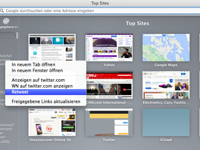 Anders als auf twitter.com, der Twitter-App oder Dritt-Apps fehlt in Safari allerdings die sonst omnipräsente Retweet-Schaltfläche. Stattdessen muss in Safari mit der rechten Maustaste auf einen Link geklickt werden. Im Kontextmenü findet sich anschließend an fünfter Stelle die Retweet-Funktion.
