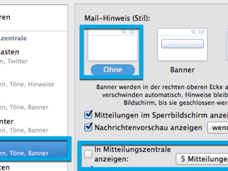 Alternativ können Sie aber auch bestimmte Anwendungen wie Mail aus der Mitteilungszentrale entfernen, indem Sie in den Mitteilungen-Einstellungen die entsprechenden Häkchen entfernen.