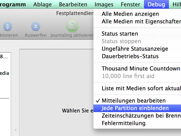 Das Debug-Menü, in dem sich die Funktion Jede Partition einblenden befindet, kann über folgenden Befehl im Terminal aktiviert werden: defaults write com.apple.DiskUtility DUDebugMenuEnabled 1“. Um das Debug-Menü wieder verschwinden zu lassen, genügt es den Befehl erneut in die Terminal-App einzugeben, jedoch mit einer 0 am Ende statt der 1.