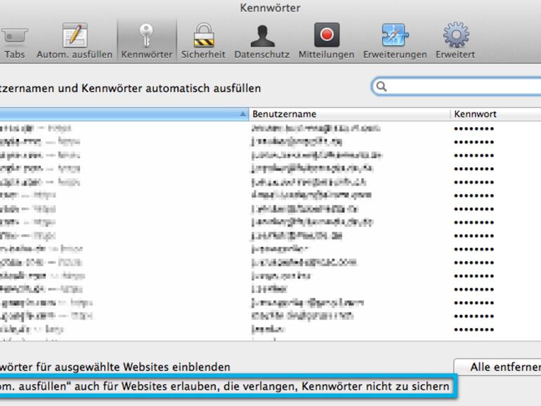 Allerdings kann in den Einstellungen im Reiter Kennwörter ein Häkchen gesetzt werden, wodurch dieser Wunsch künftig ignoriert wird. Die Option befindet sich ganz unten und nennt sich „Autom. ausfüllen“ auch für Websites erlauben, die verlangen, Kennwörter nicht zu sichern.