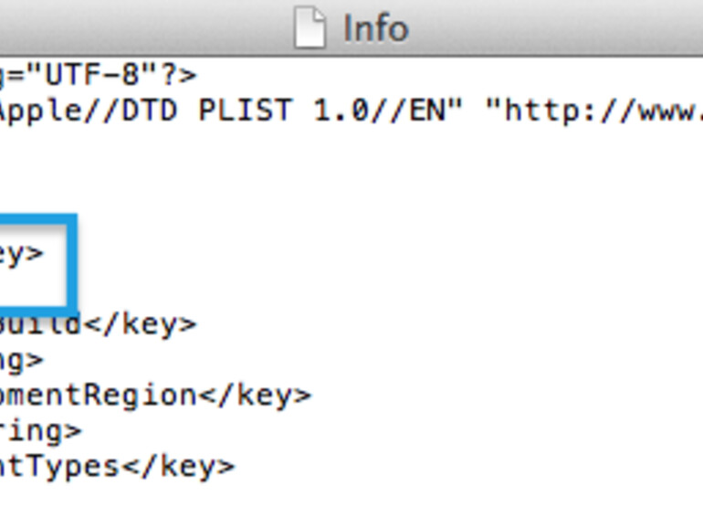 Öffnen Sie Info.plist mit TextEdit.app und fügen Sie in der sechsten Zeile, direkt unter <dict> folgende Zeilen ein: