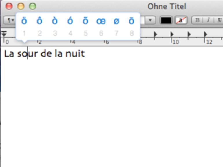 Sinnvollerweise bietet OS X Lion, anders als iOS, als ersten Eintrag der neuen Einblendliste nicht die unmarkierte Grundform des Buchstaben sondern direkt nur die mit diakritischen Zeichen versehenen Varianten an.