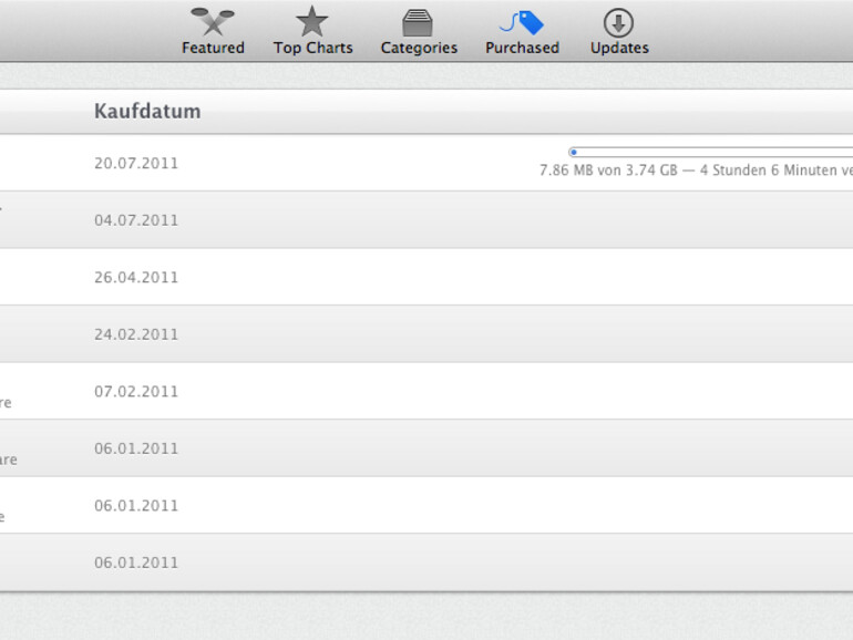 Nicht im Dock, denn dort visualisiert das nach dem Kauf abgelegte Lion-Icon den Fortschritt des Downloadvorgangs lediglich grob über einen kleinen Statusbalken. Um die aktuell tatsächlich übertragene Datenmenge in Augenschein nehmen zu können und einen Blick auf die Schätzung bezüglich der bis zum Abschluss des Downloads benötigten Zeit zu erhaschen, muss der Mac App Store geöffnet werden. Dort wechselt man auf den Reiter Purchased: In der dort hinterlegten Liste der gekauften Apps lässt sich der aktuelle Status des Lion-Downloads einsehen – eventuell muss man aber einige Sekunden Geduld walten lassen, bis der Lion-Download nach der Anwahl der Purchased-Schaltfläche tatsächlich angezeigt wird.