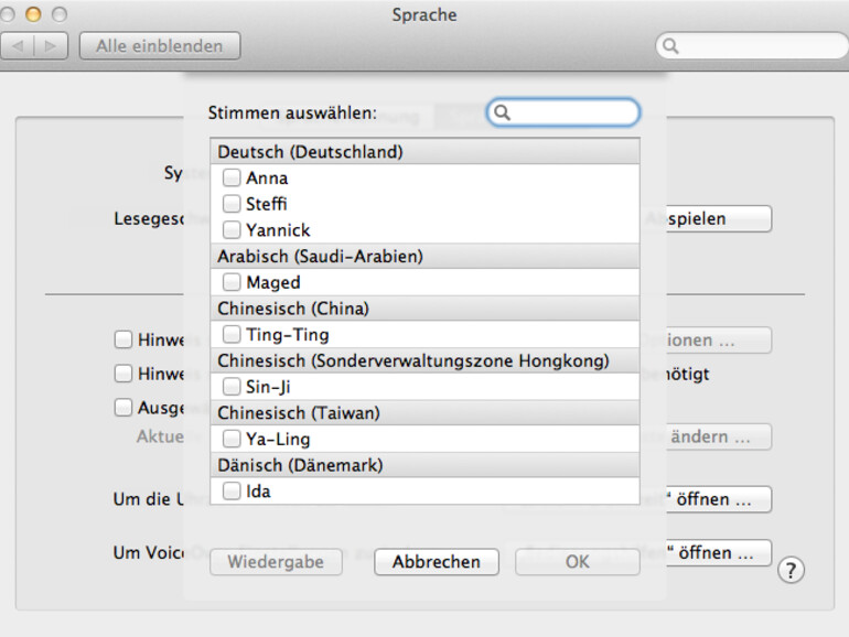 Öffnen Sie zur Installation der deutschen Systemstimmen die Systemeinstellungen und klicken Sie dort auf Sprache. Im ersten Pull-Down-Menü können Sie weitere Stimmen auswählen, darunter auch die neu hinzugekommenen deutschen Stimmen Anna, Steffi und Yannick. Bestätigen Sie ihre Auswahl mit einem Klick auf OK, die ausgewählten Stimmen werden dann heruntergeladen.