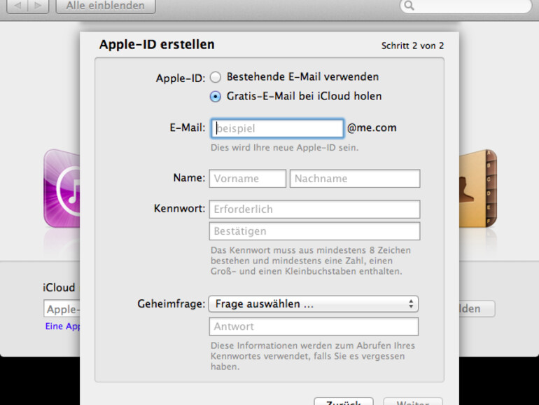 Eine Apple-ID kann sowohl mit einer eigene, bestehenden E-Mail-Adresse eingerichtet werden als auch mit einer neuen @me.com-Adresse. Während bei der Verwendung einer eigenen Adresse auf die Mail-Funktionalität verzichtet werden muss, stehen alle anderen iCloud-Funktionen zur Verfügung