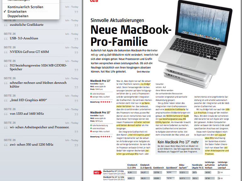 Eine Übersicht aller Anmerkungen bietet Vorschau anschließend über Hervorhebungen und Notizen im Menü Darstellung oder aber über die Schaltfläche auf der linken oberen Seite zum Wechseln der Ansicht. Freunde von Tastaturkürzeln erreichen die Übersicht ganz einfach via alt+cmd+4 (⌥⌘4).