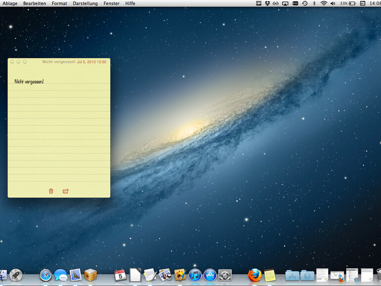 Bevor eine eigenständige Notiz auf den Schreibtisch wandert, muss diese erst mit einem Doppelklick auf den Titel in der mittleren Liste der Notizen geöffnet werden. Anschließend kann das Notizen.app-Hauptfenster geschlossen werden. Über Fenster und Oben schweben kann die Notiz anschließend auch so eingerichtet werden, dass diese grundsätzlich über allen anderen Fenstern und geöffneten Programmen sichtbar bleibt. Einziges Manko: Wird Notizen.app geschlossen und erneut gestartet, zeigt sich anstelle der ausgelagerten Notiz wieder das Hauptfenster.