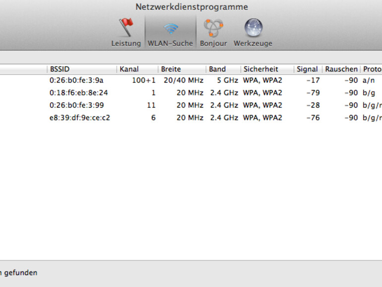 Die darauf folgende Willkommens-Botschaft kann getrost ignoriert werden. Öffnen Sie einfach über Ablage die Netzwerkdienstprogramme oder rufen Sie diese mit cmd+n (⌘N) auf. In der WLAN-Suche werden anschließend sämtliche WLAN-Netze in der Umgebung samt verschiedener Parameter gelistet. Dabei gilt es vor allem, auf die in negativen Werten dargestellten Angaben Signal und Rauschen zu achten. Je kleiner die Zahl, desto schwächer ist die Störung (Rauschen), aber auch das Signal. Der Signal-Wert sollte also möglichst hoch (-10 ist besser als -80) und der Rauschwert möglichst niedrig (-80 ist besser als -10) sein.
