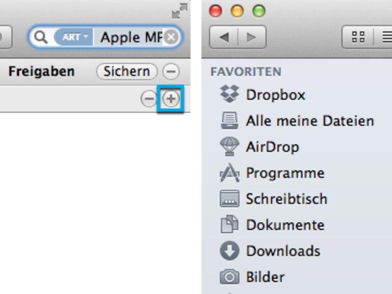 Starten Sie wie gewohnt Ihre Suche im Finder. Achten Sie darauf, dass nicht der „Alle meine Dateien“-Ordner links markiert ist, sondern ein willkürlicher anderer Ordner, beispielsweise der Downloads-Ordner. Geben Sie nun oben rechts Ihren Suchbegriff ein und klicken Sie auf das Plus-Symbol (+), direkt unterhalb des Suchfeldes.