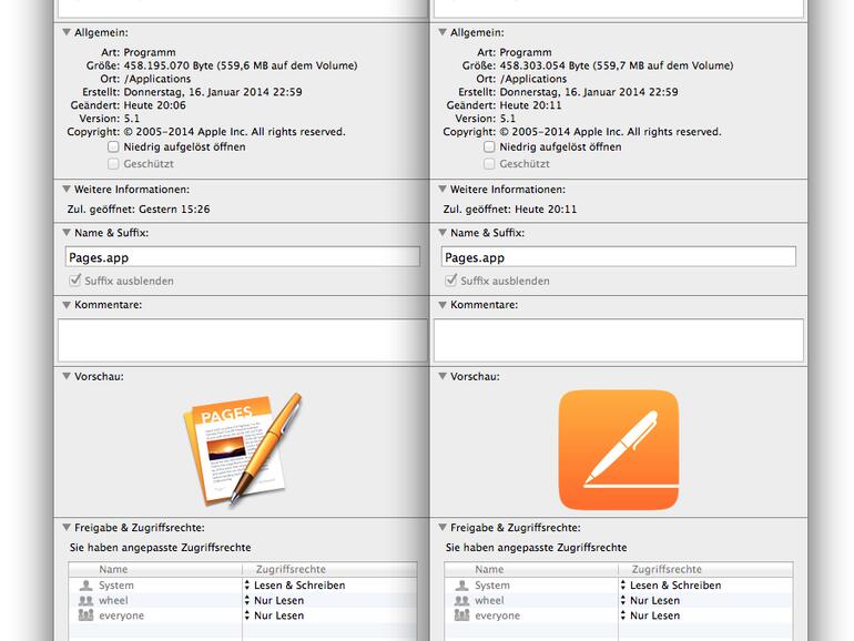 Markieren Sie nun oben links auf das kleine Original-Symbolbild, fügen Sie das neue per CMD+V oder Bearbeiten > Einfügen ein und bestätigen Sie den Kopierprozess mit Ihrem Passwort. Nach einem Neustart der App sollte das neue Symbolbild angezeigt werden.