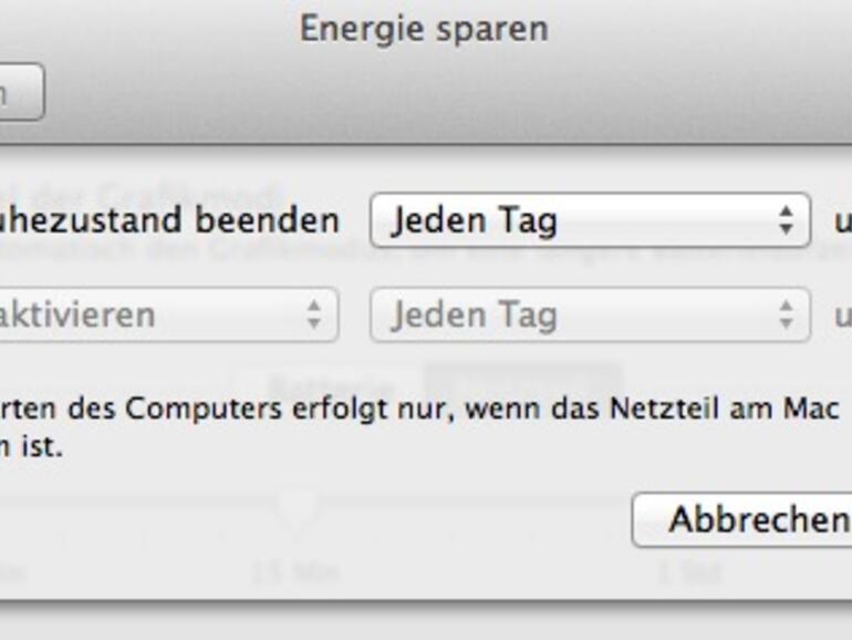 Denn der Mac kann sich auf Wunsch komplett selbstständig zur gewünschten Urzeit einschalten. Öffnen Sie dazu einfach in den Systemeinstellungen unter Energie sparen unten rechts den Zeitplan. Aktivieren Sie anschleißend die erste Box Starten oder Ruhezustand beenden und stellen Sie die gewünschte Zeit ein.